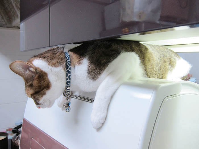 今も伸び上がって食洗機の上から