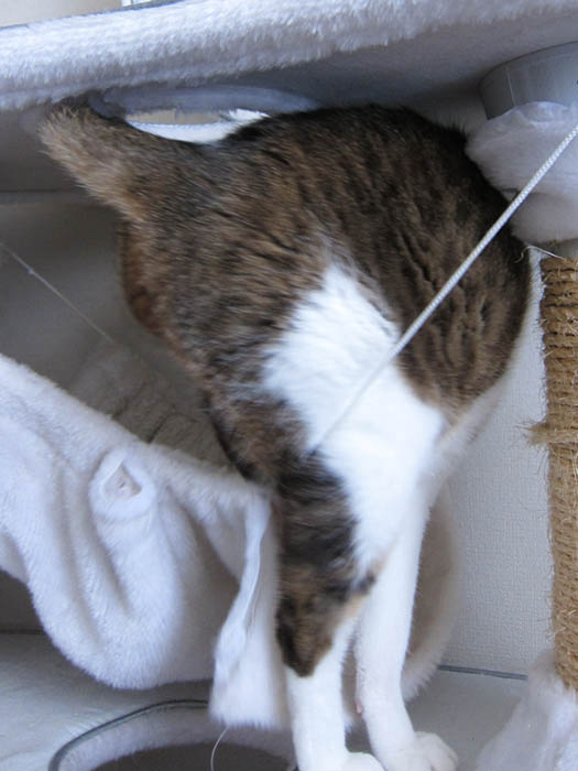 何故か猫タワーへと逃げて行きました。