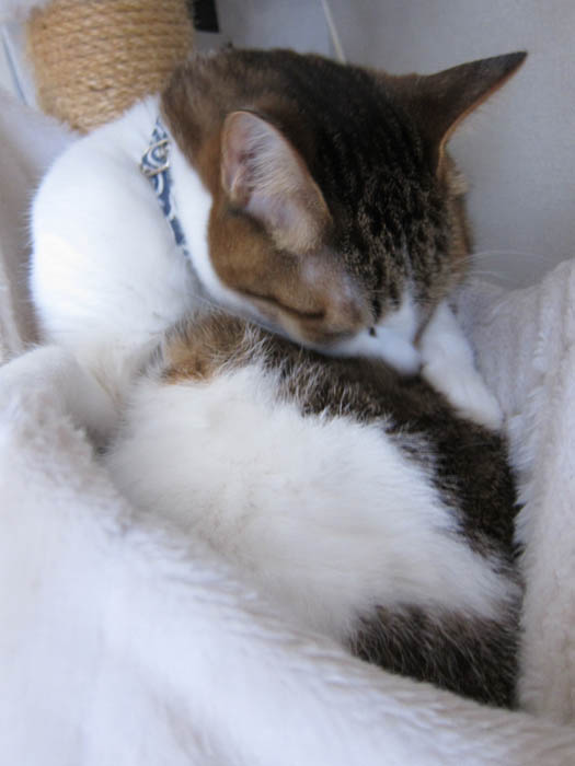 2011年 2/17(木) 915日目のぴっち♀とぽっけ♂ ~猫文字遊び~新規写真追加。ぴっち♀が自分のイニシャルを体で表現しています。ぽっけ♂はマイペースにお昼寝。