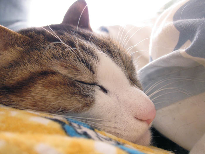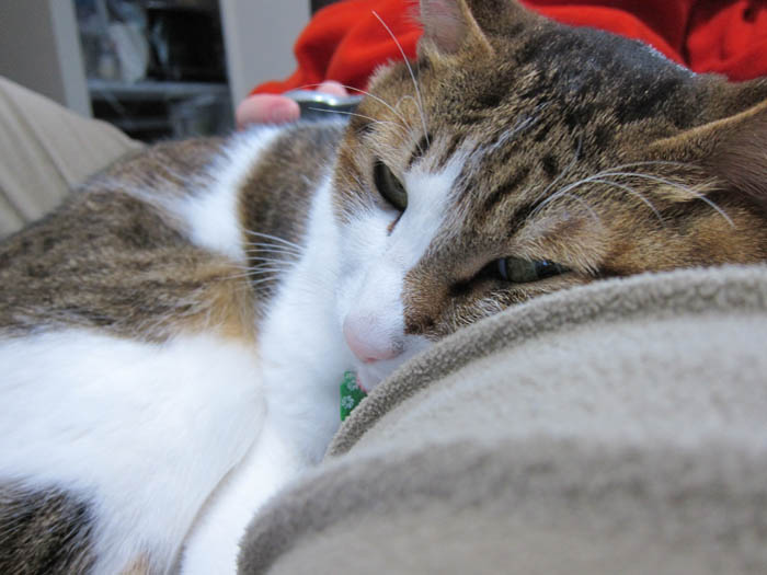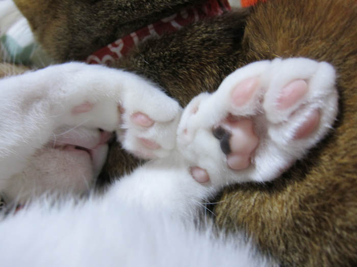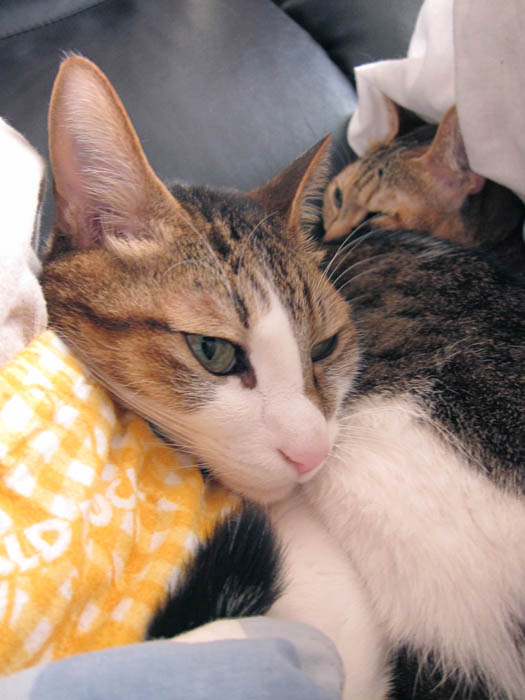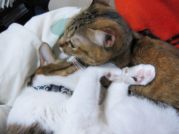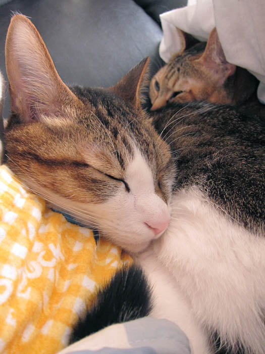 2010年 1/18(月) 520日目のぴっち♀とぽっけ♂ ~重要な向き~私の上半身の上で2匹がお昼寝する際、重要なことは【体の向き】。なぜかと言うと……。