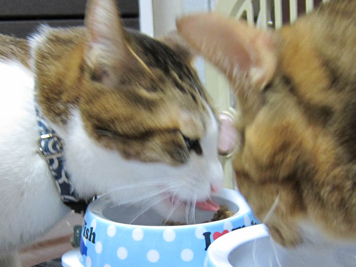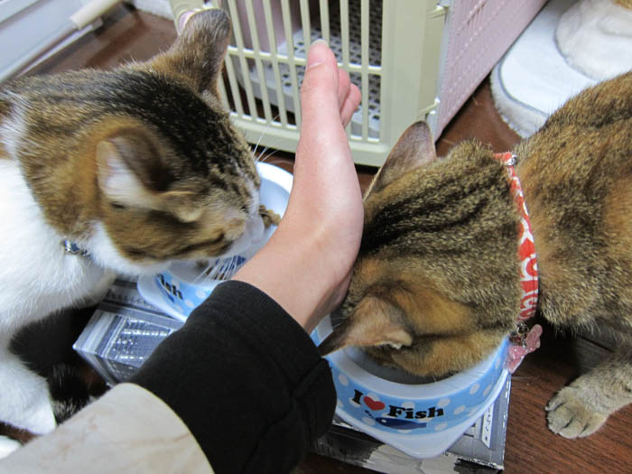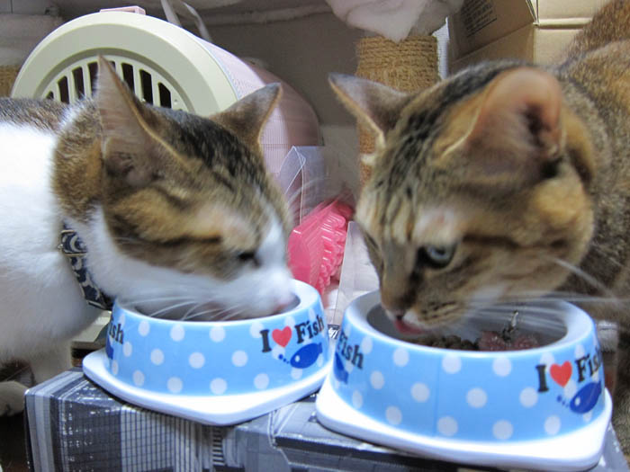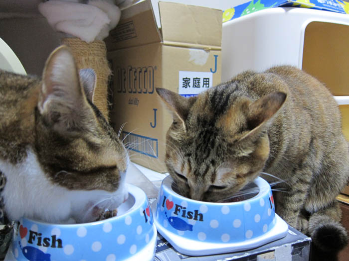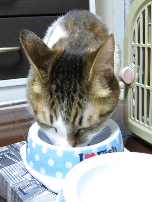 2008年 12/7(日) 113日目のぴっち♀とぽっけ♂ ~匂いに釣られて……~空になったお皿を舐めたり、のけぞってみたりするぽっけ♂と、もふーんとしているぴっち♀。