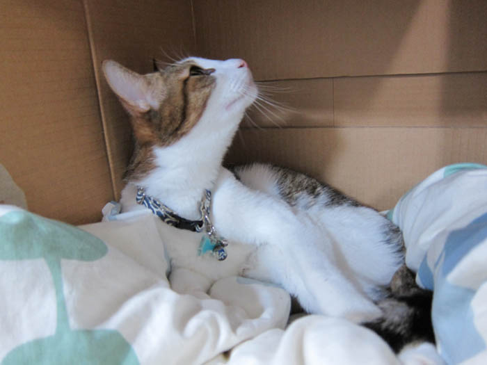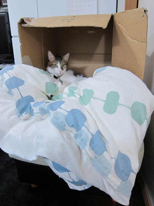 「かまくらが崩れて、座布団になっちゃったね」その分広くなった段ボール。