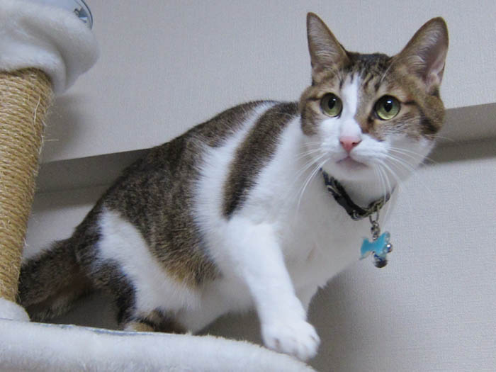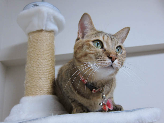 に捕まるまいと、猫タワーの安全圏【最上段】に避難しました。