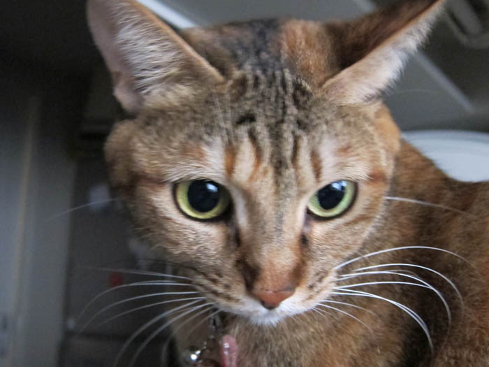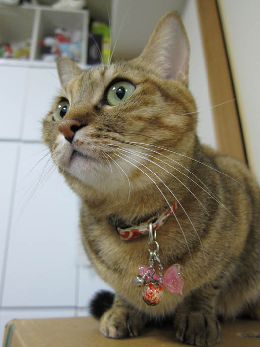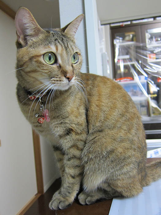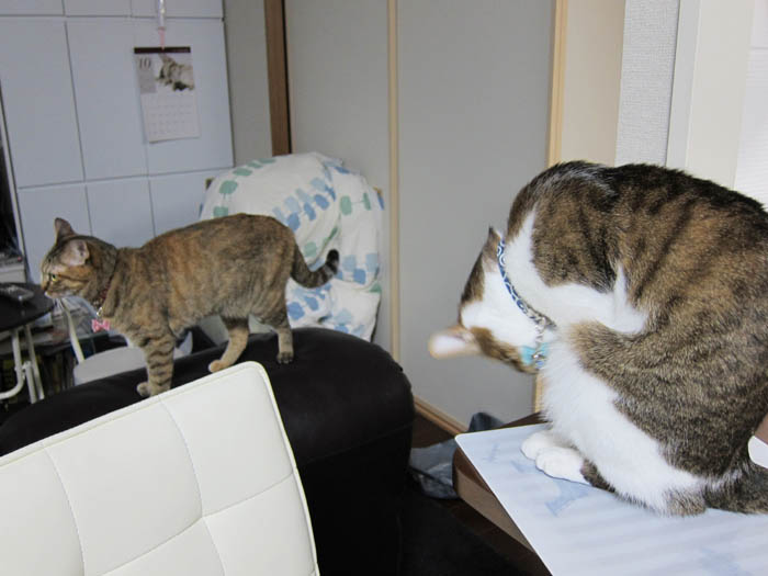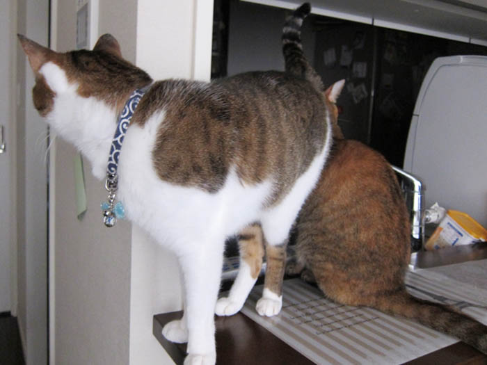 2010年 12/15(水) 851日目のぴっち♀とぽっけ♂ ~カウンターでの戦い~私との間合いを取ってキッチンのカウンターに佇む2匹。ごはんを狙っていますが、その位では負けません。