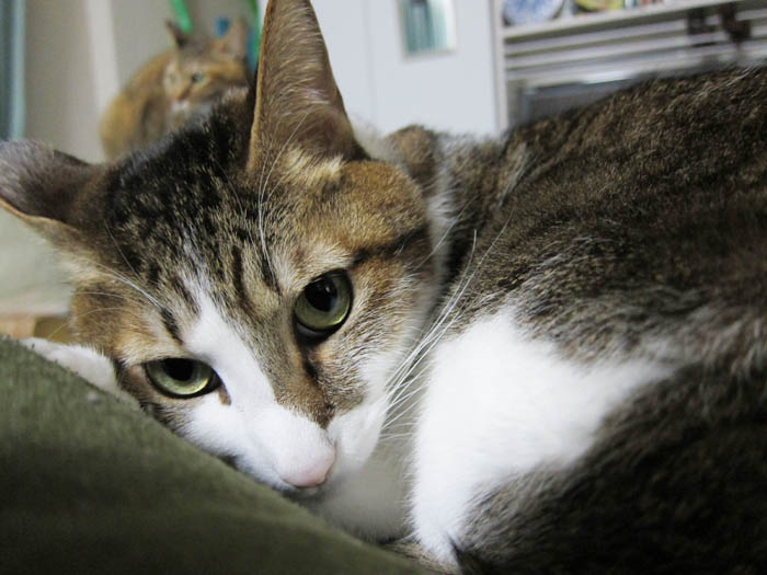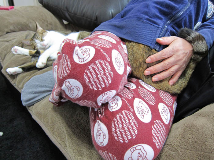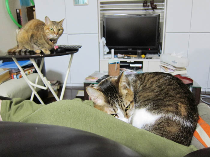 2011年 12/7(水) 1208日目のぴっち♀とぽっけ♂ ~膝に2匹盛り~お昼寝にかけるぽっけ♂の執念。ぴっち♀はコンパクトなので、まあそれなりに枕に……。