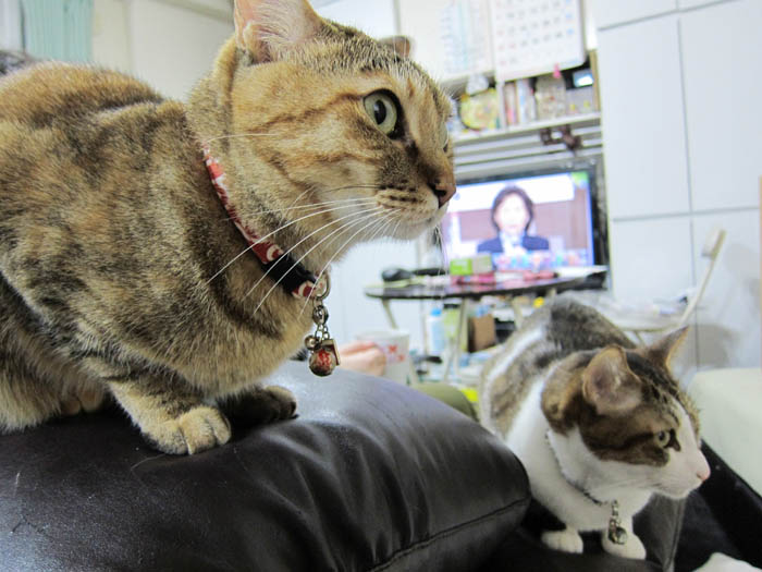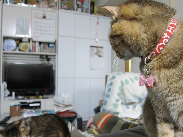 2008年 12/16(火) 122日目のぴっち♀とぽっけ♂ ~2匹で気になる~猫タワーの【丸】で仲良く寝ていた2匹。目を覚ましてまず気に留めたのは……。