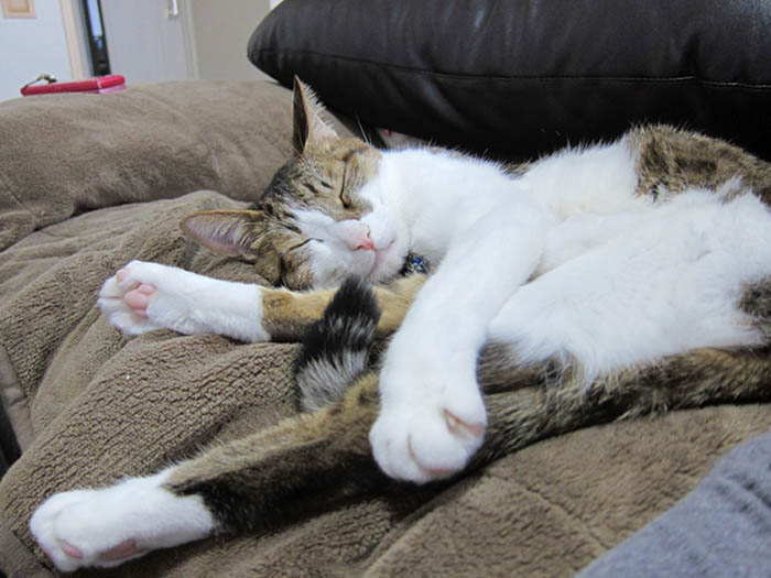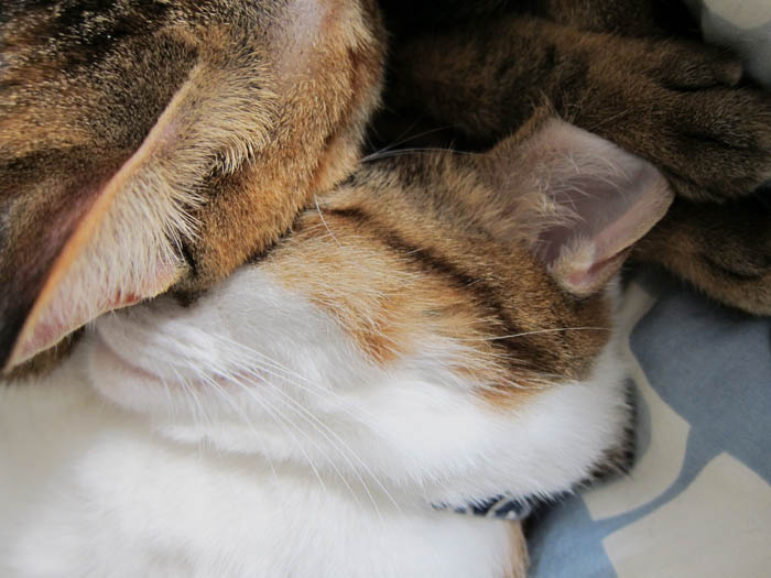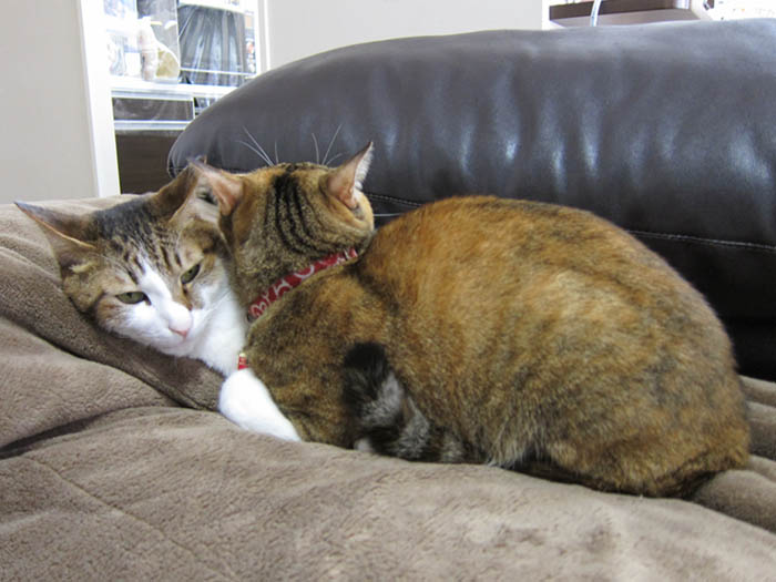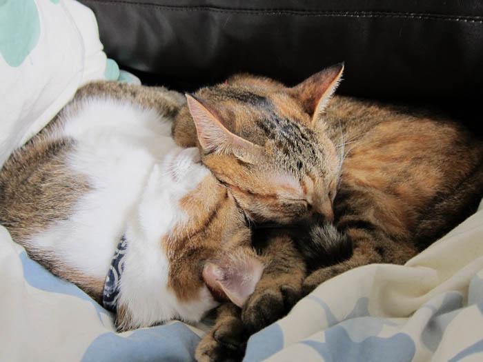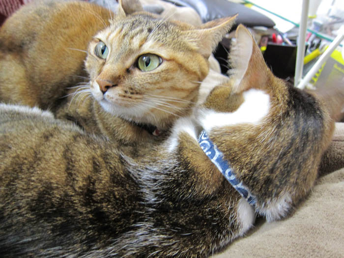 新規写真追加。猫ベッドの中で2匹が色々。ぽっけ♂の寝相バリエーションとぴっち♀のあくび。