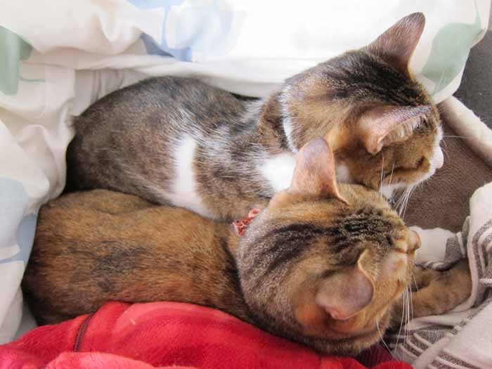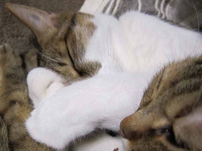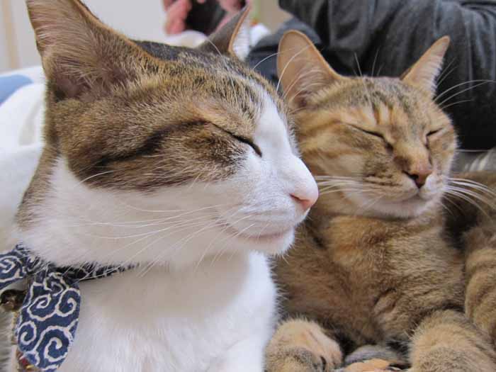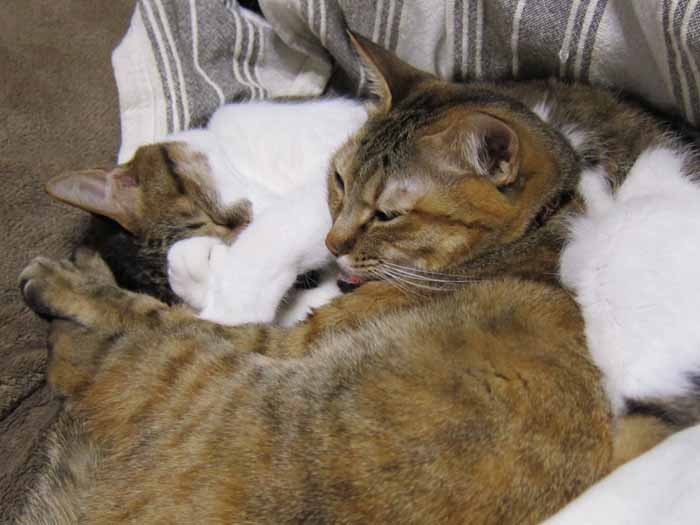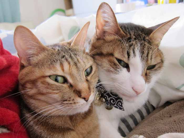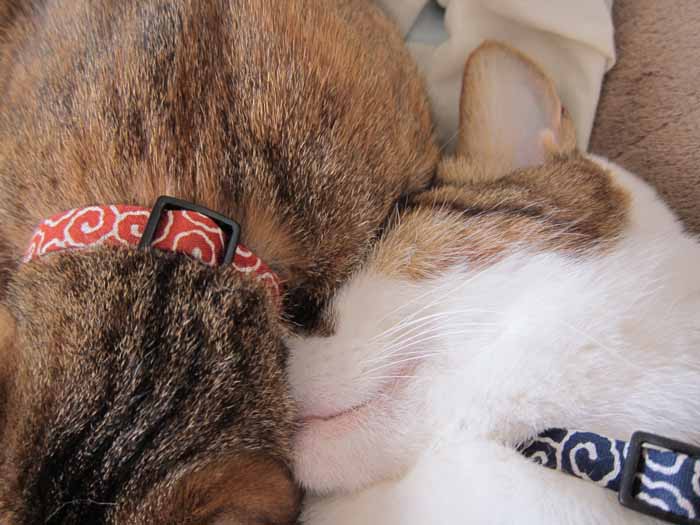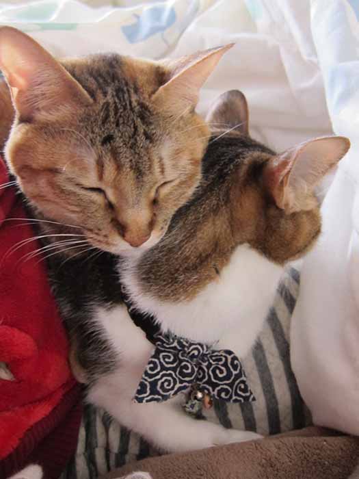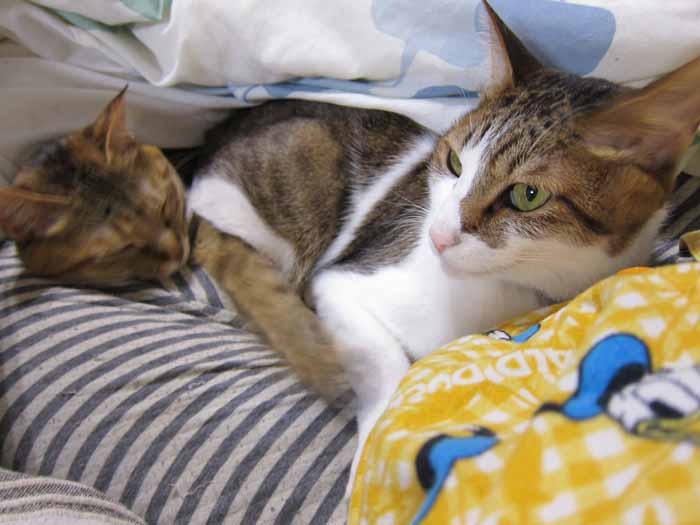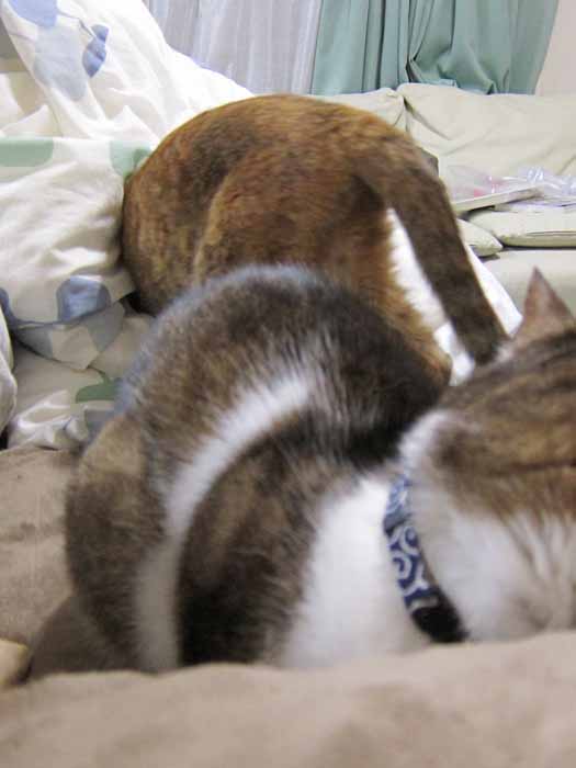 2012年 3/14(水) 1306日目のぴっち♀とぽっけ♂ ~猫の寝床事情~先客がいる寝床へ合流する時の2匹のルールを守らないと……。