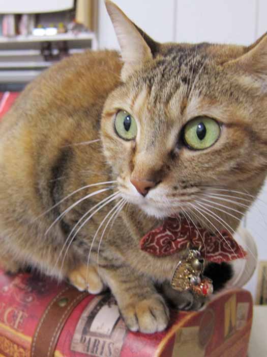 ミニテーブルの上に立ち座りしているぴっち♀。