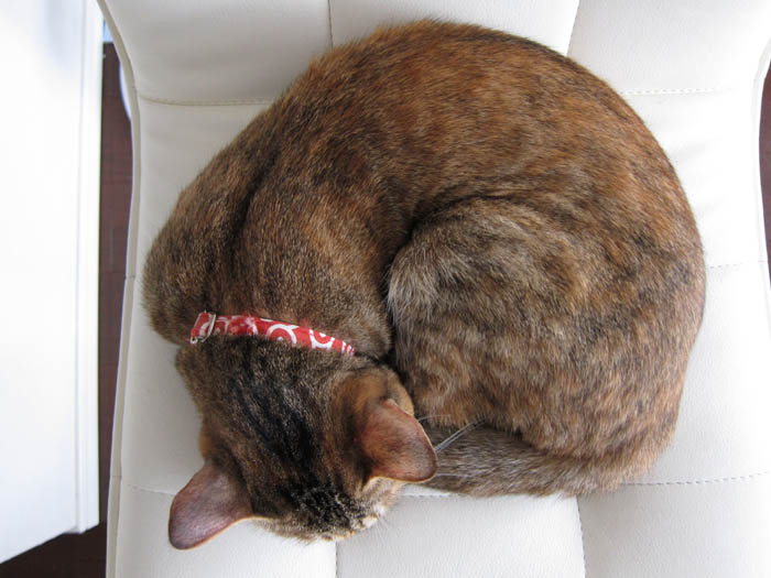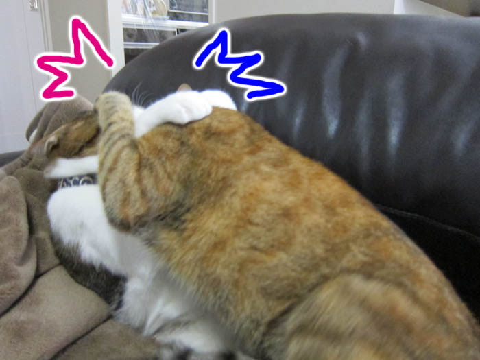 2011年 12/4(日) 1205日目のぴっち♀とぽっけ♂ ~ケンカの勝敗判定法~2匹のケンカの勝敗は、その場で見ていなくてもわかるのです。ソファーの背もたれ、3年分の重み。