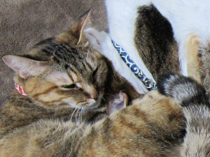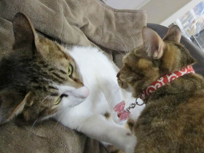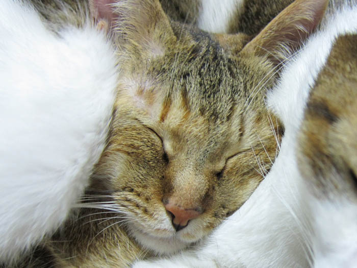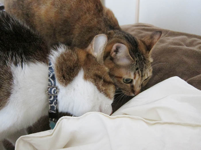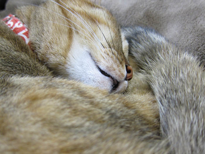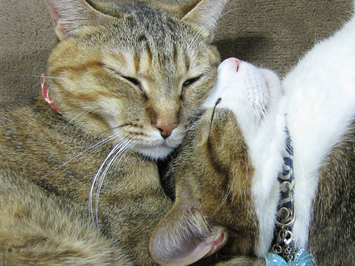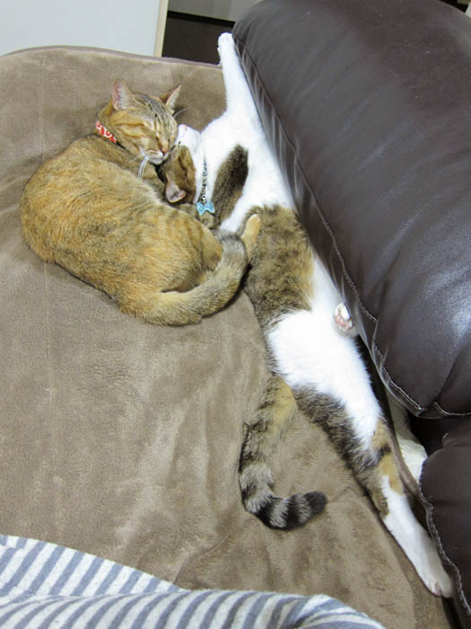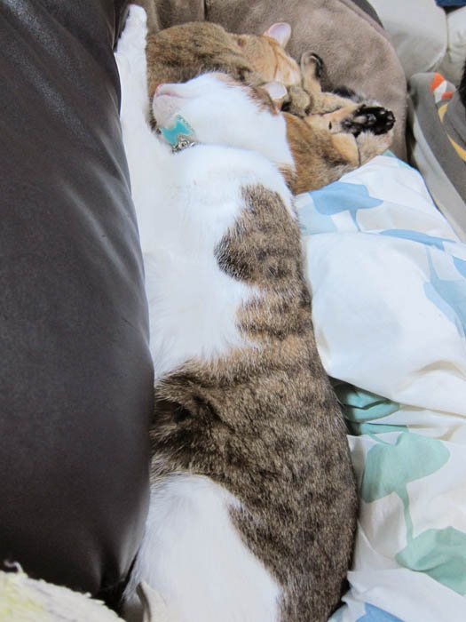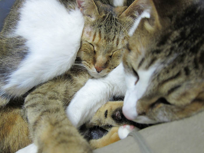 2匹が頬と頭をくっつけてお昼寝に励んでいます。