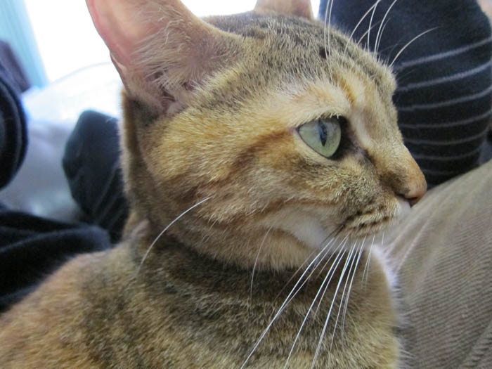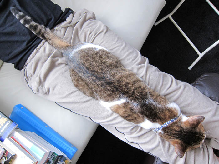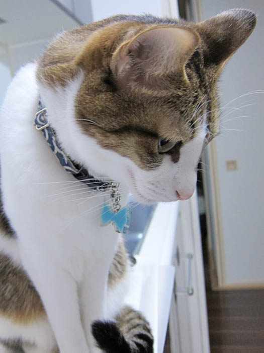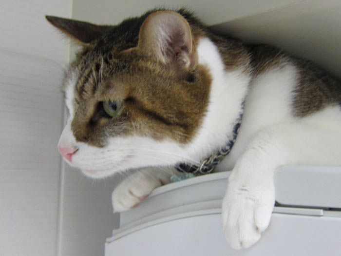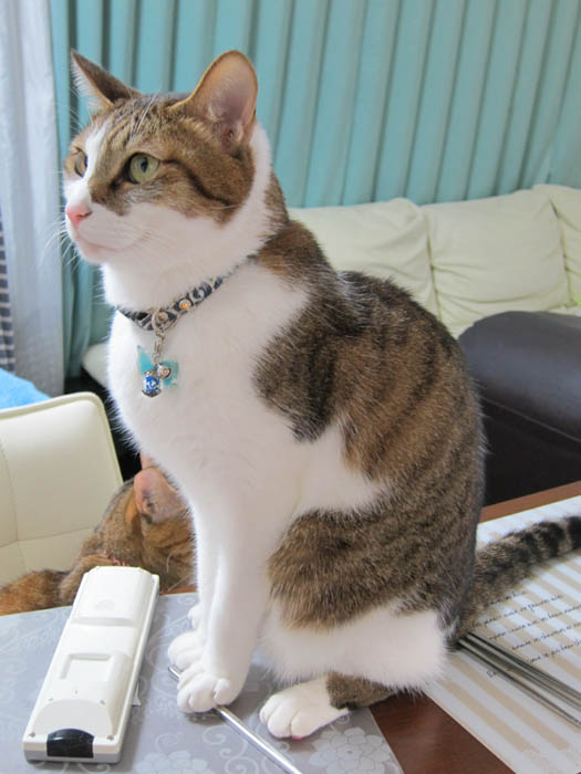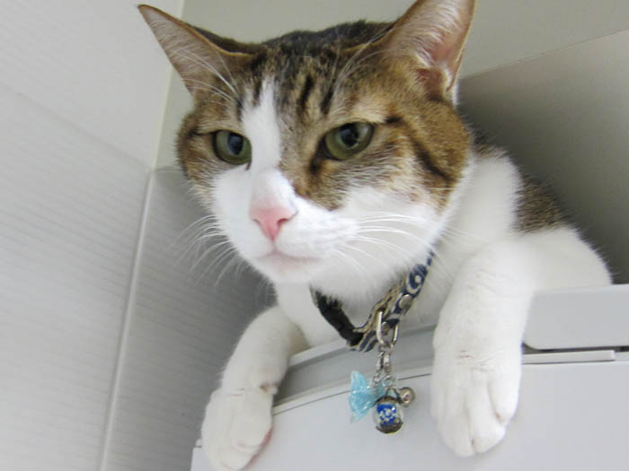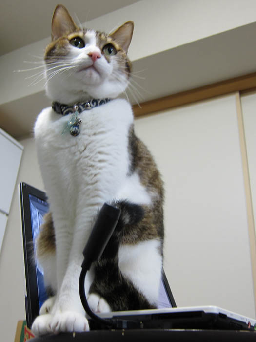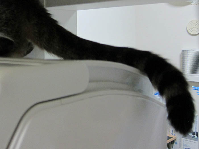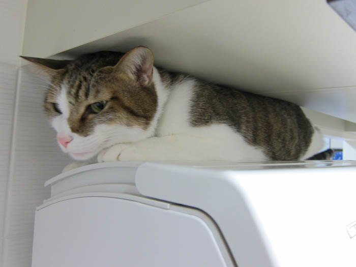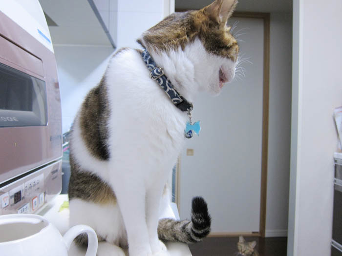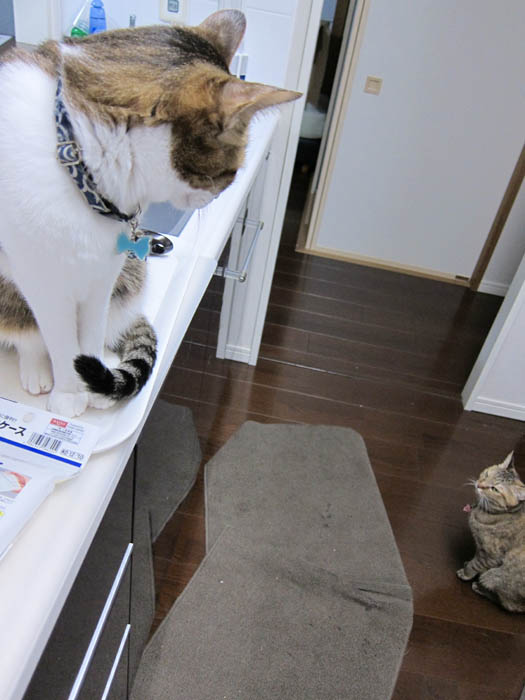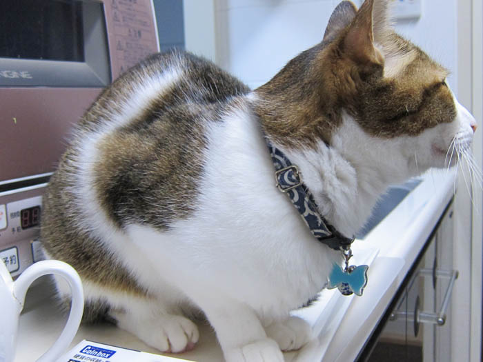 すぐに膝の上か開いた隙間にやって来るので、気にしません(笑)。