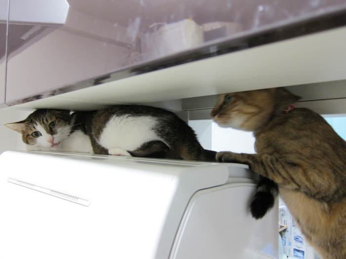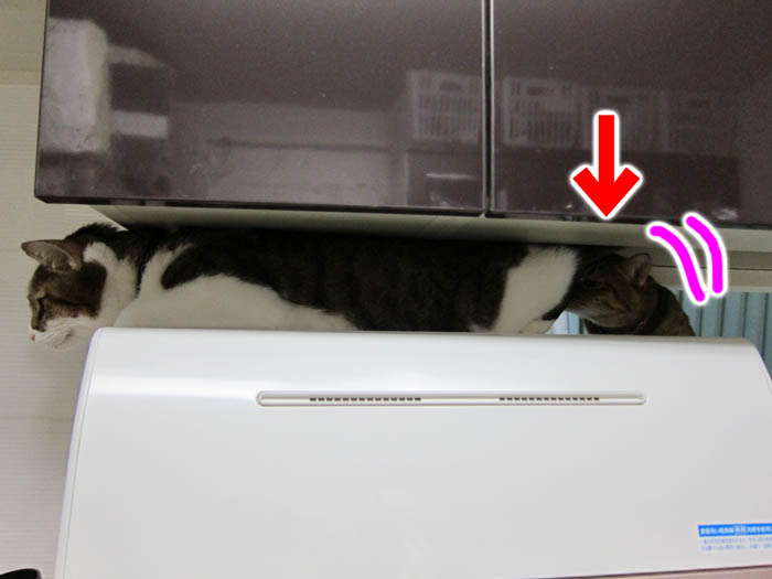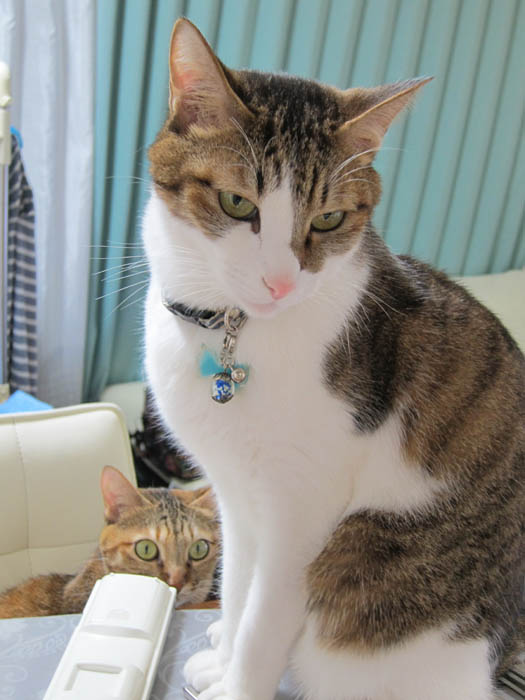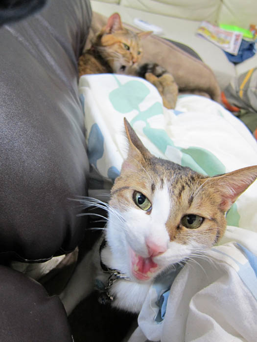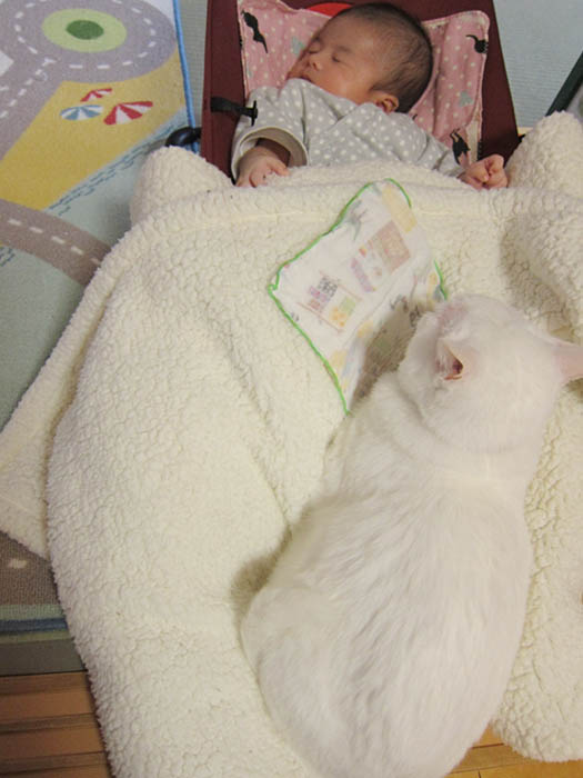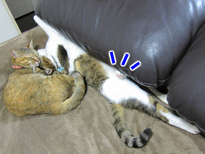 」気持ち良さそうにしている2匹を退かすのが忍びないらしく、