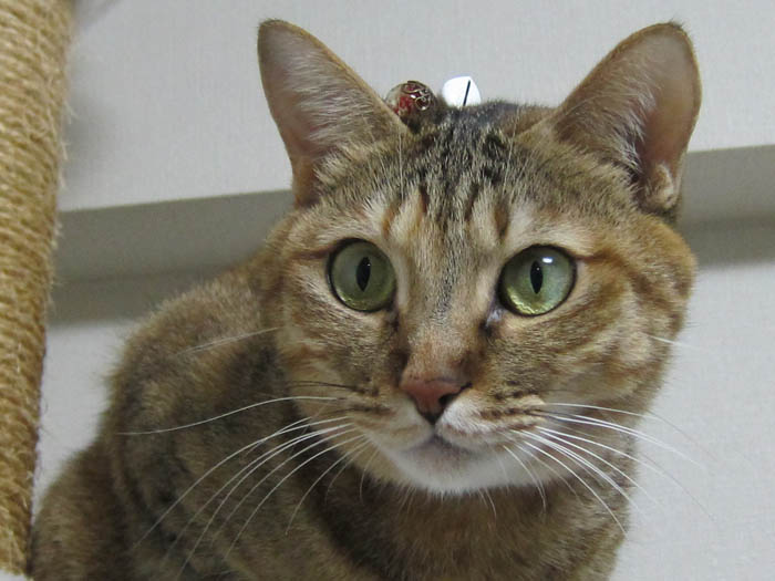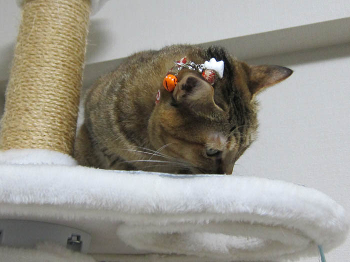首輪のチャームが頭の上に乗っているのです。