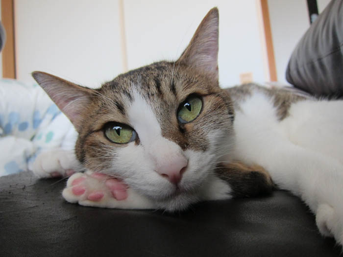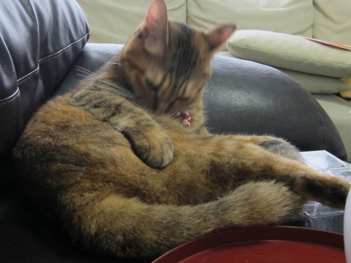 茶色ソファーの横に寝そべりました。