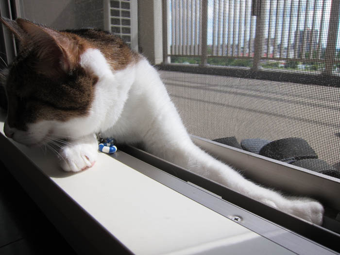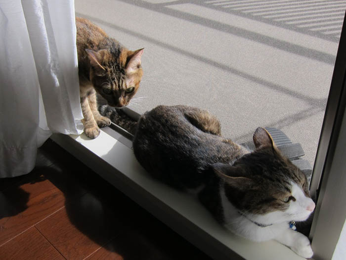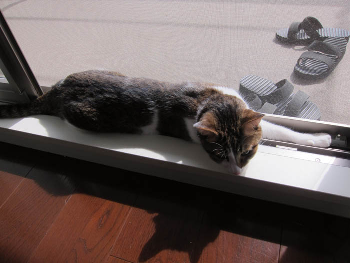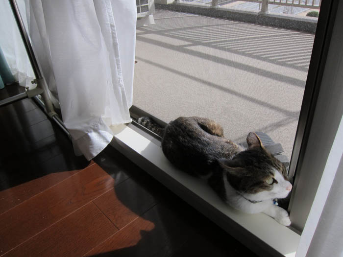 ぽっけ♂がサッシで暖を取っていました。