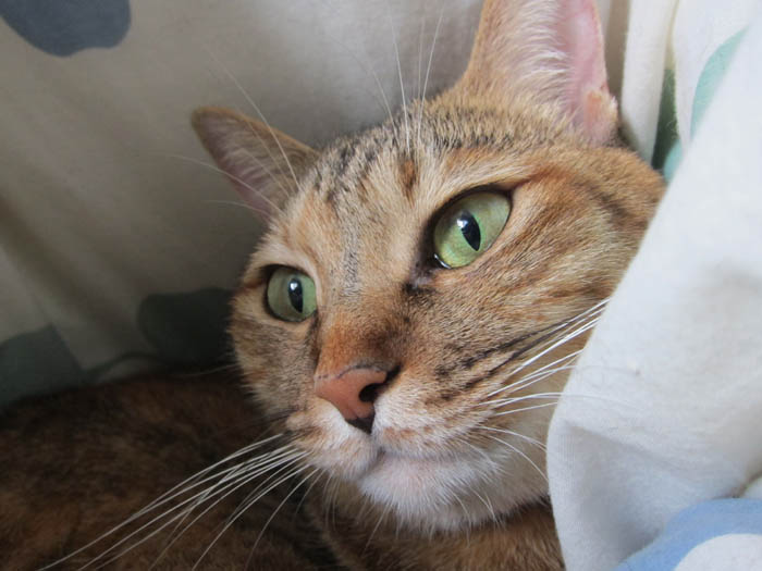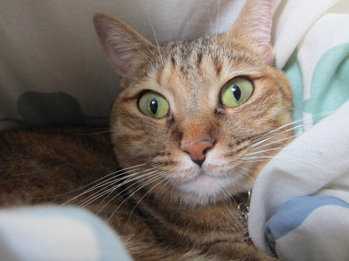 +タオルケット+とあるクッションの3層式ベッドにご機嫌のぴっち♀。そのクッションとは……。