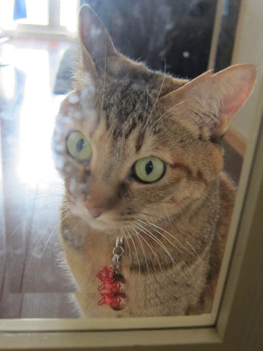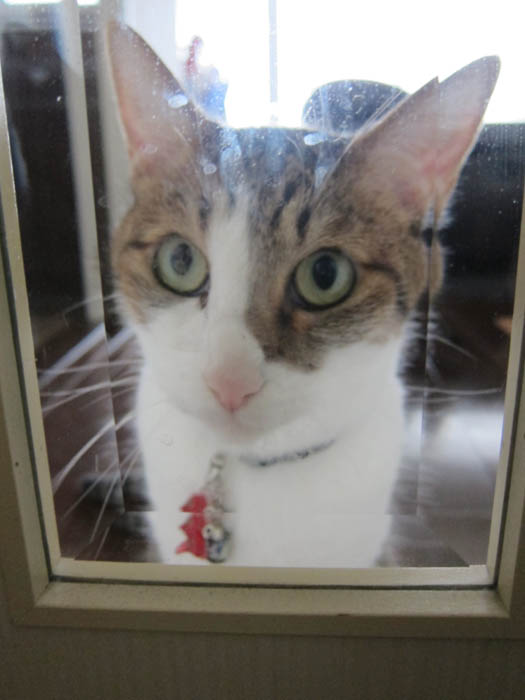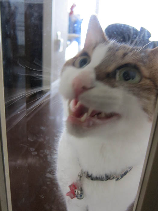 2011年 9/5(月) 1115日目のぴっち♀とぽっけ♂ ~ドア越しにゴハン~廊下へのドア越しにゴハンをアピールする2匹。ガラス窓の縁の斜めカットで面白効果になりました。