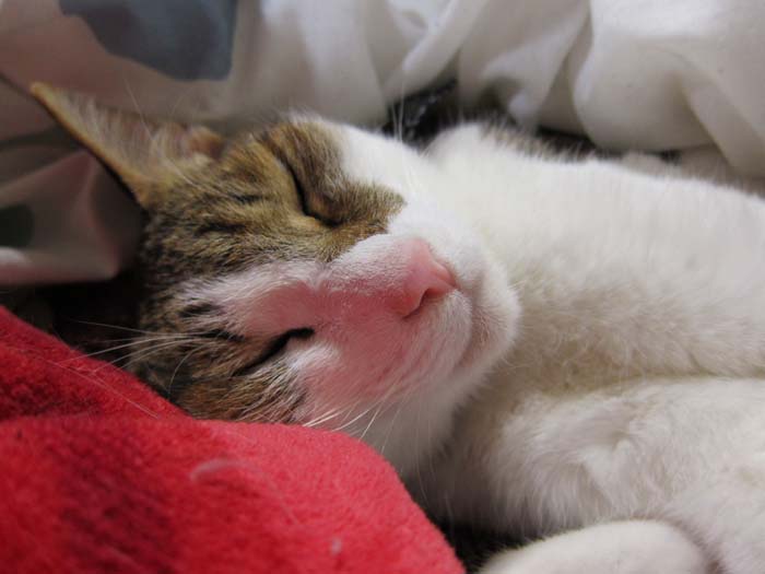 2012年 2/16(木) 1279日目のぴっち♀とぽっけ♂ ~お腹ベッド~遊びに来た母親のお腹をベッドに気持ち良さそうに寝ている2匹。それぞれイイカンジの寝姿です。
