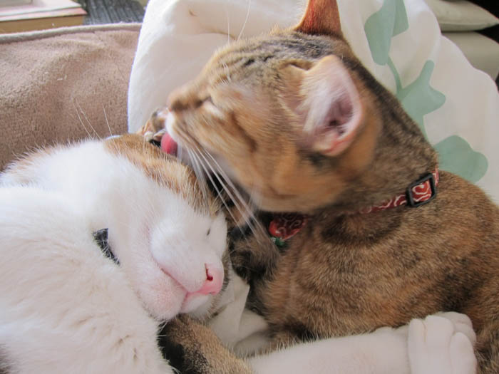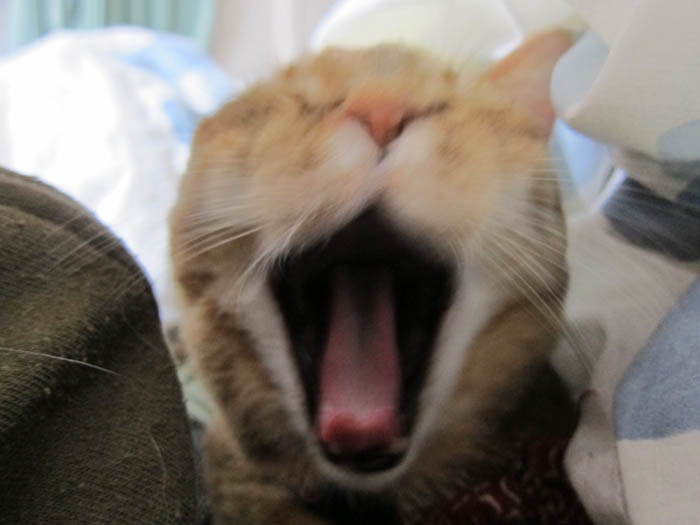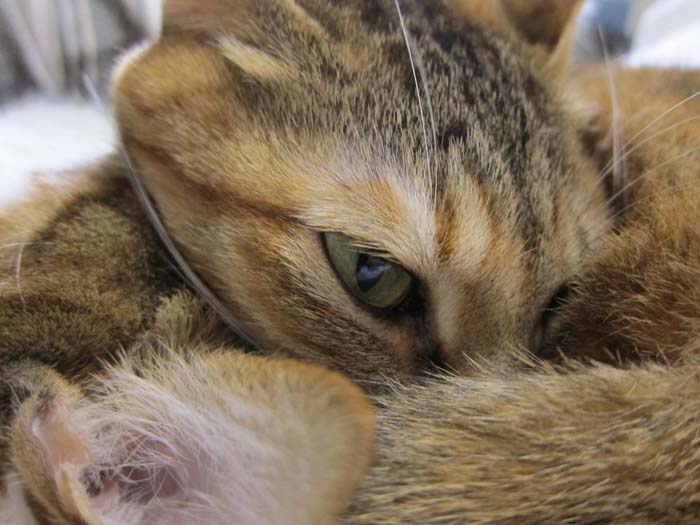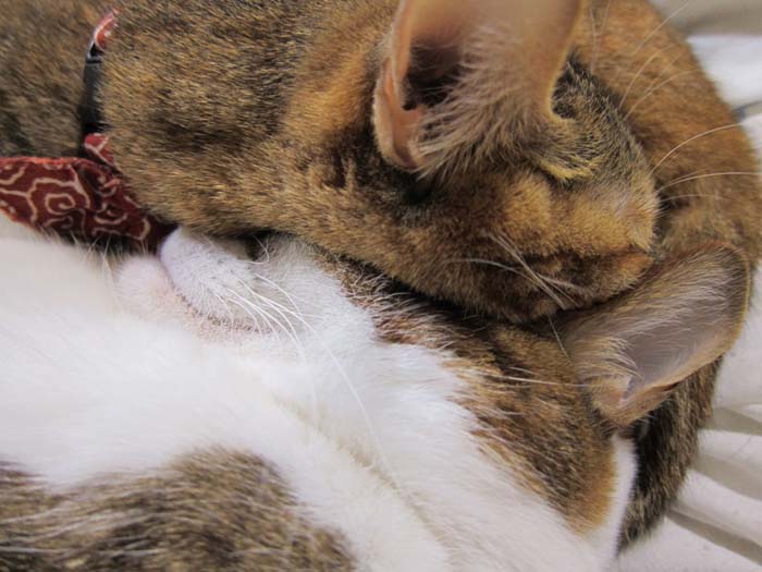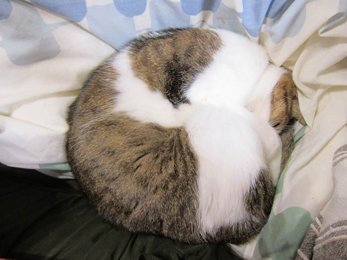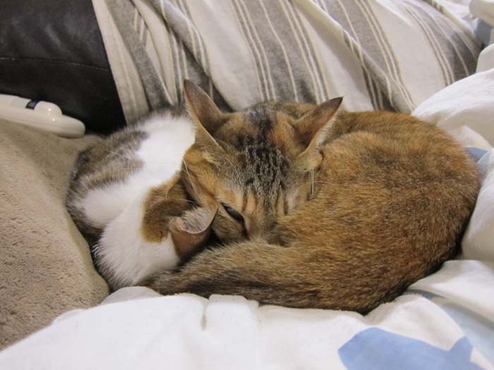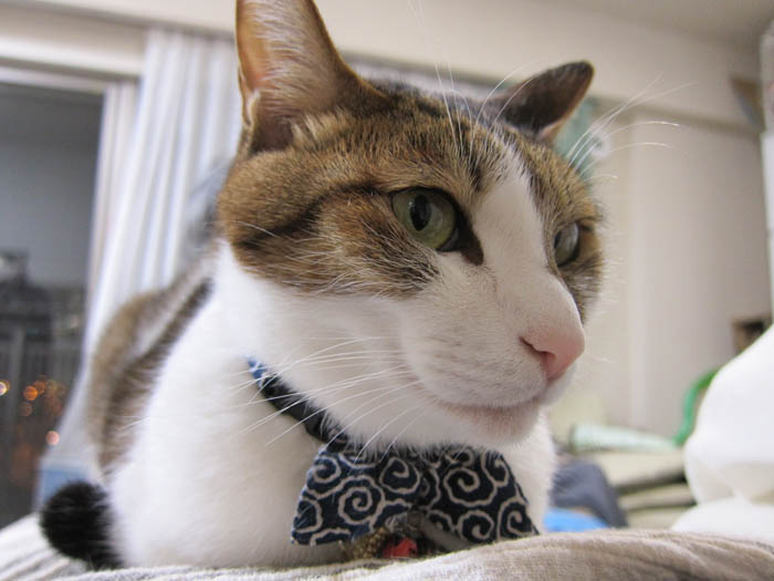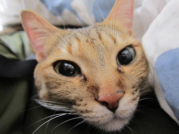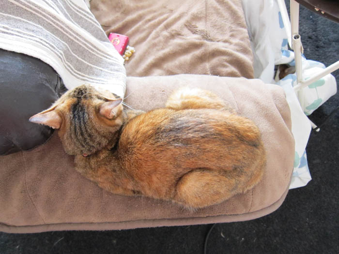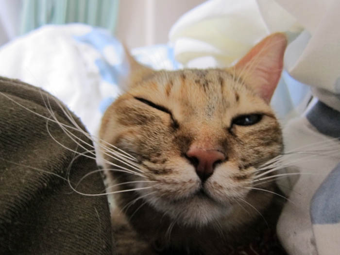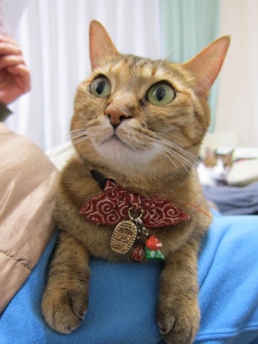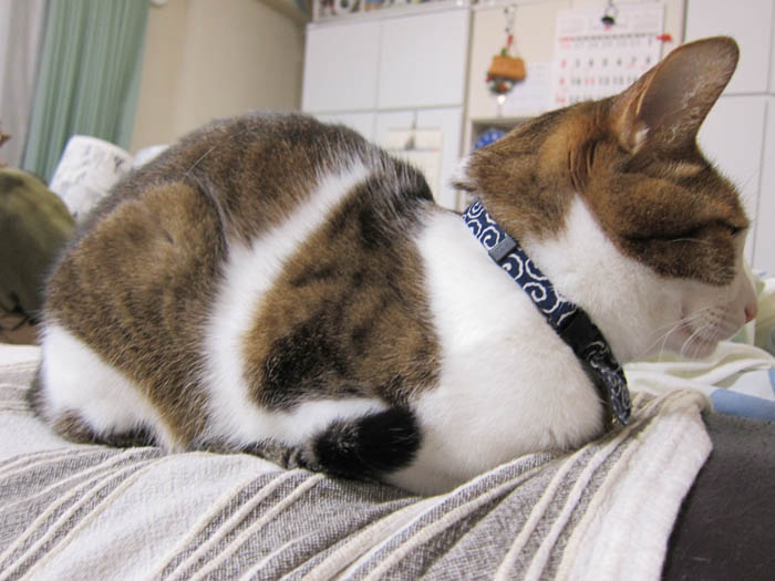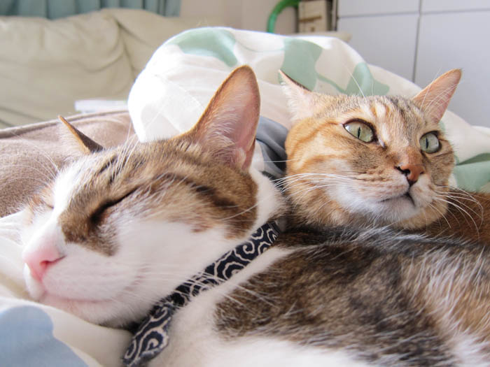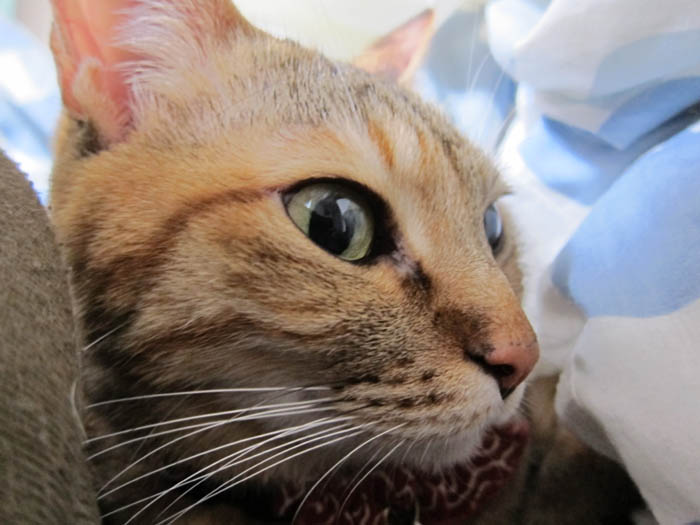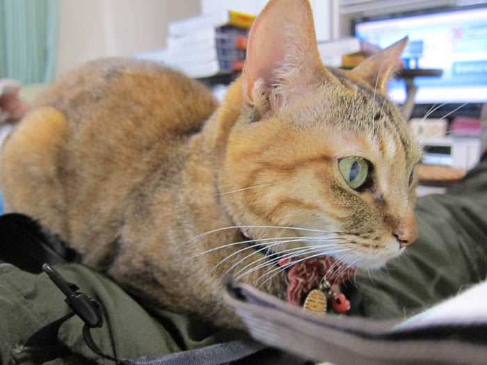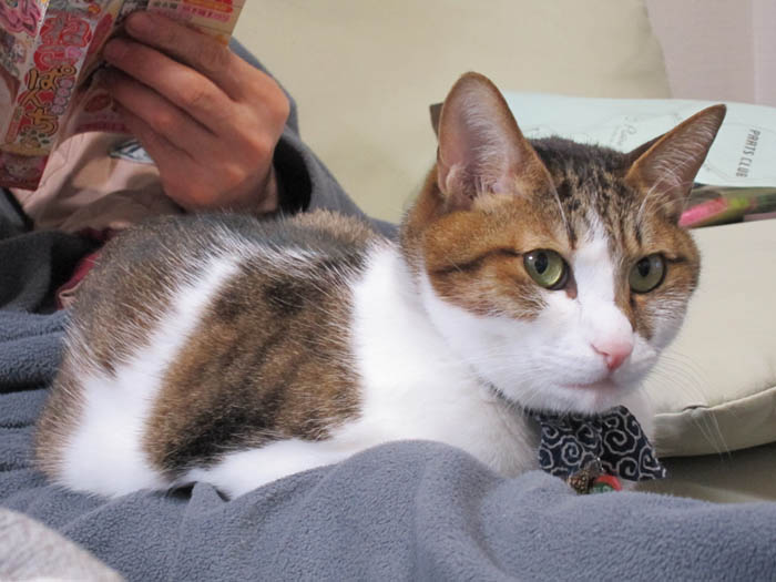 2011年 2/6(日) 904日目のぴっち♀とぽっけ♂(1) ~しっぽの額乗せ~新規写真追加。母親の膝をベッドに我が物顔でくつろぐぽっけ♂。大きい目にびっくり~。