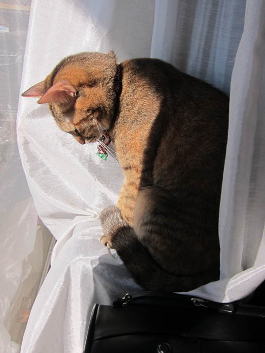 2011年 2/2(水) 900日目のぴっち♀とぽっけ♂ ~般若と探偵~ぴっち♀はカウンターの椅子で般若に、ぽっけ♂は床で久しぶりの探偵になりました。