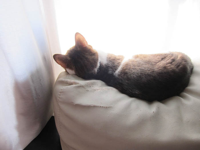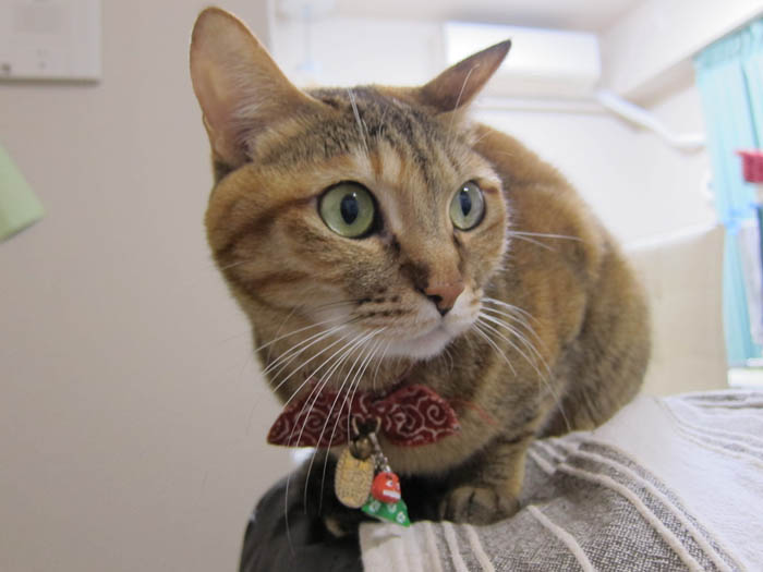 ソファーの背もたれに鎮座中のぽっけ♂。