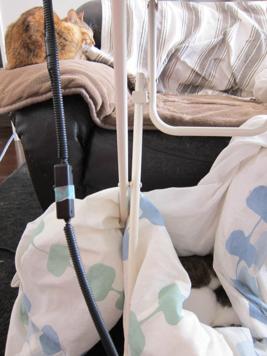 が降った日の2匹。暖を求めてカーボンヒーターの前で炙られてみたり。