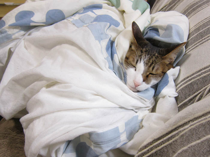 2012年 2/6(月) 1269日目のぴっち♀とぽっけ♂ ~布団の隙間から~大人気の羽毛布団。隙間から顔と手を出して温度調整をしたりと、2匹は上手に使いこなしています。