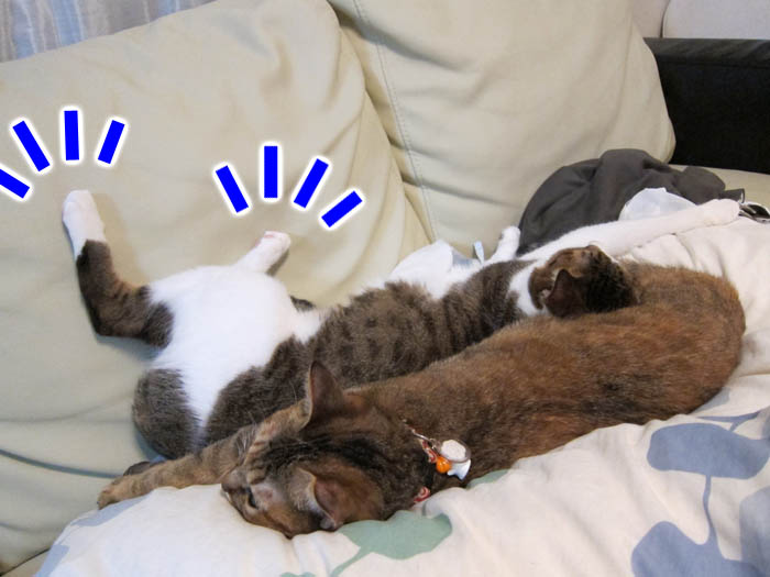 2009年 11/7(土) 448日目のぴっち♀とぽっけ♂ ~石抱きならぬ猫抱き~授乳クッションに2匹盛り。幸せですが、重さに足が痺れます。そういえば、こんな拷問があったなぁ。