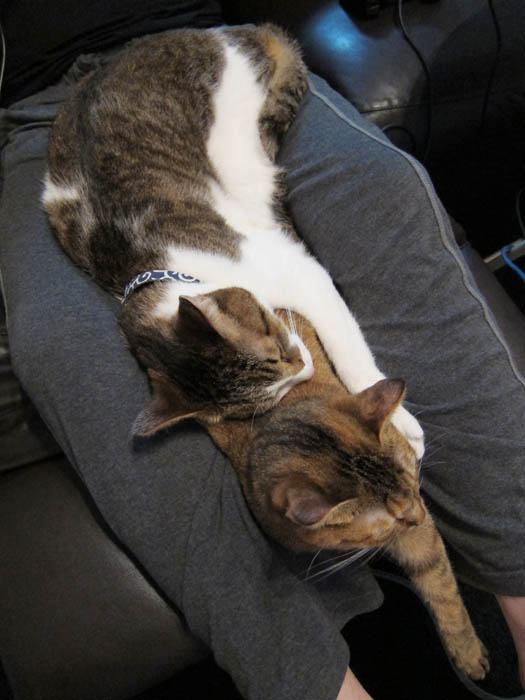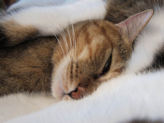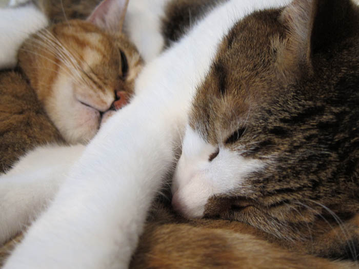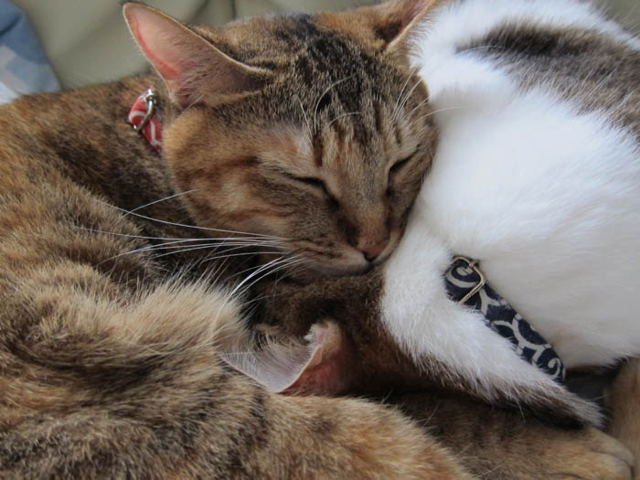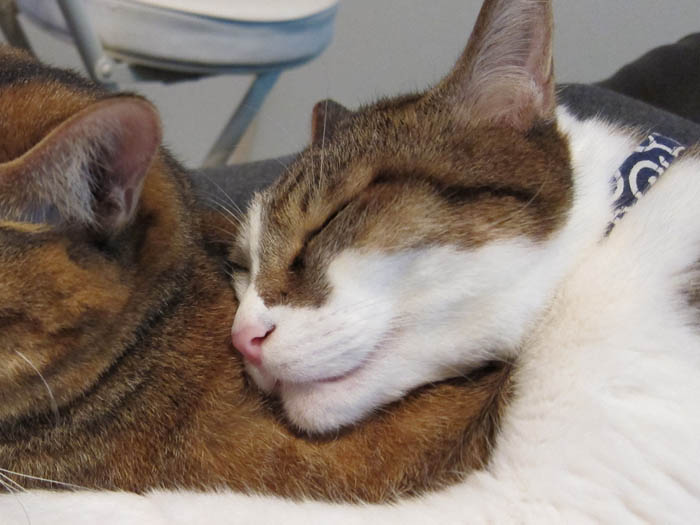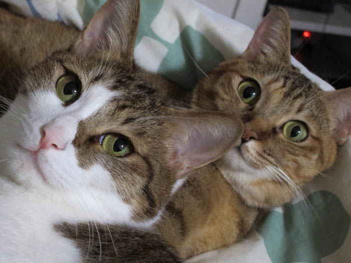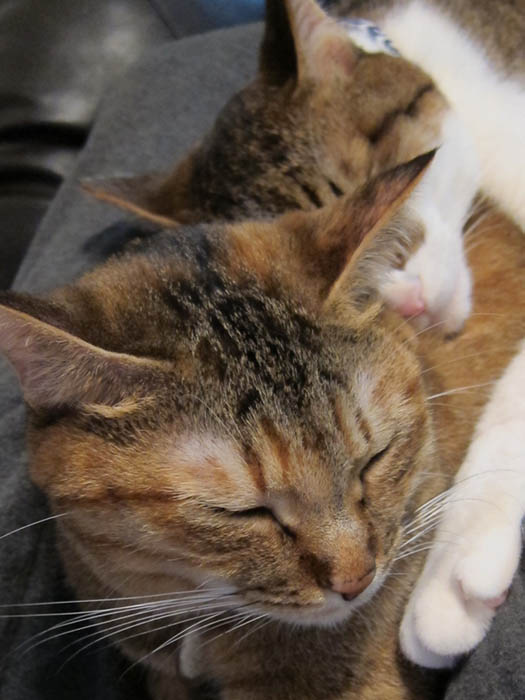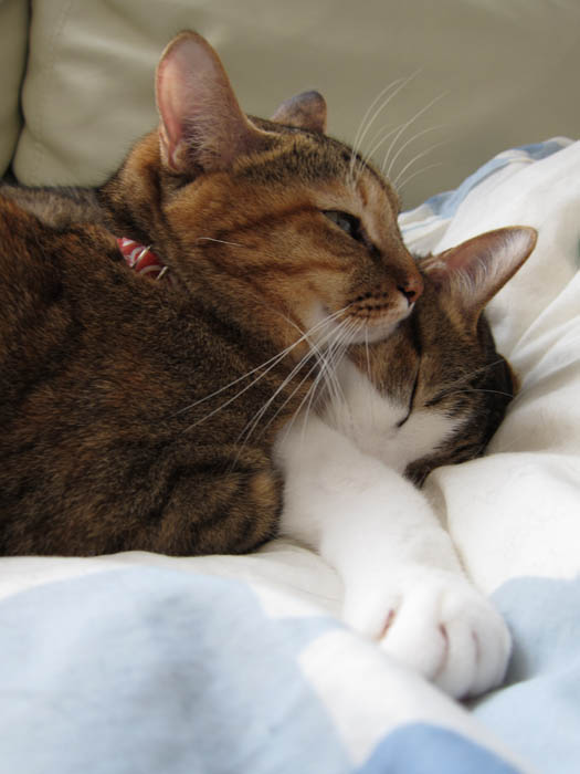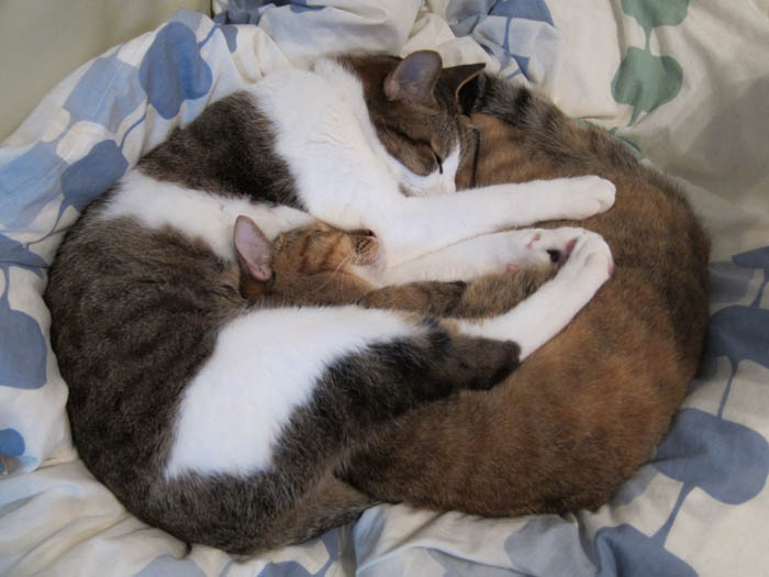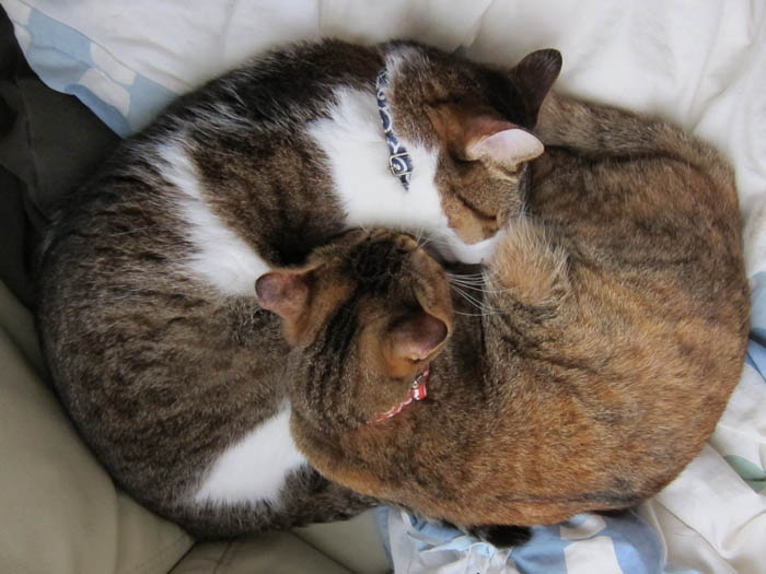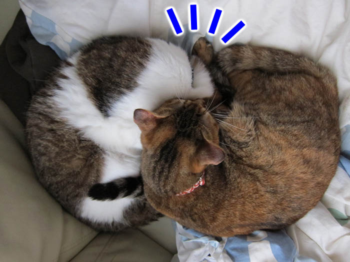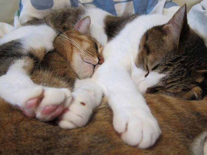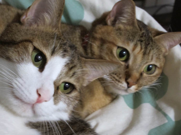 2010年 11/1(月) 807日目のぴっち♀とぽっけ♂ ~顔を寄せ合い~猫ベッドの中で顔を寄せ合いお昼寝する2匹。ほぼ正確な腹時計を持っています。