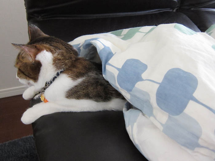 もぐいーん。ぽっけ♂布団はホカホカですが、