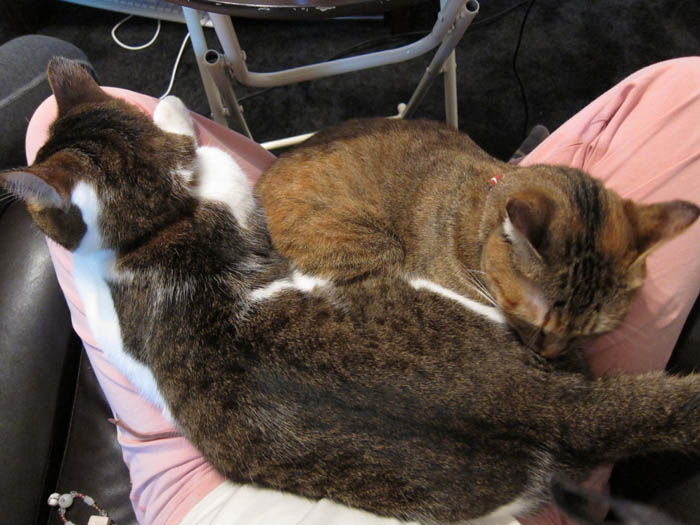 2008年 9/30(火) 45日目のぴっち♀ぽっけ♂ ~猫カンガルー再び~カンガルー袋のぴっち♀とついでにぽっけ♂も。ぴっち♀がぽっけ♂の頬をガブリ