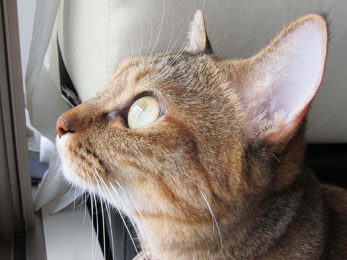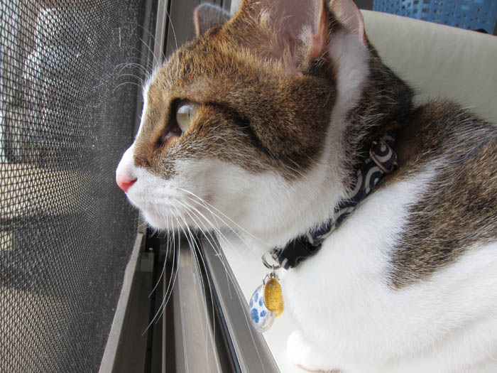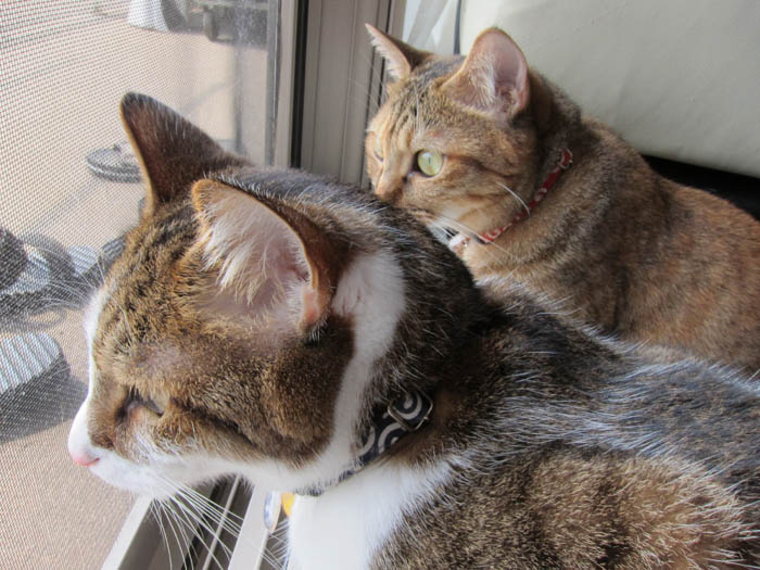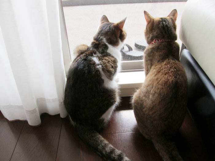 2010年 9/22(水) 767日目のぴっち♀とぽっけ♂ ~虫が気になる2匹~仲良くくっついて網戸越しにベランダに落ちている虫を狙う2匹。