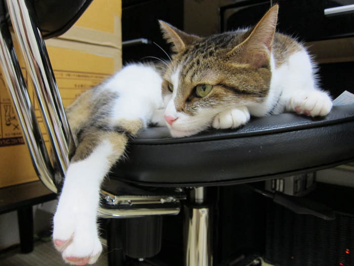 パソコン用テーブルの椅子の上で待機中。