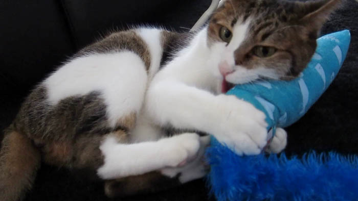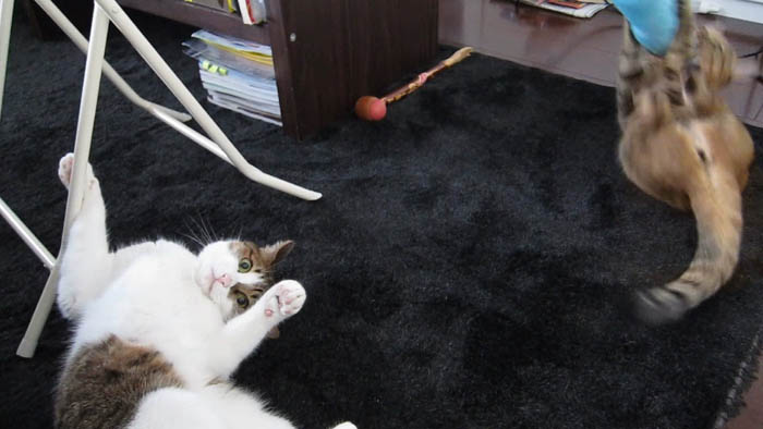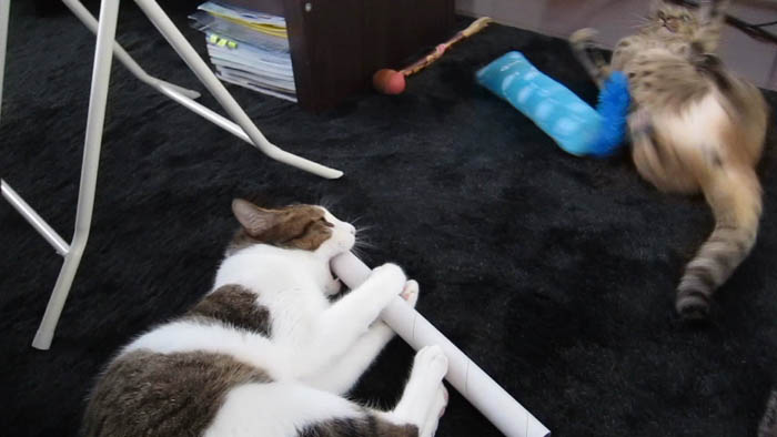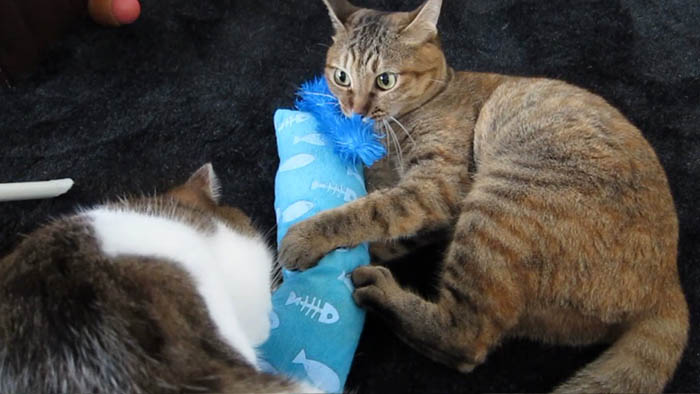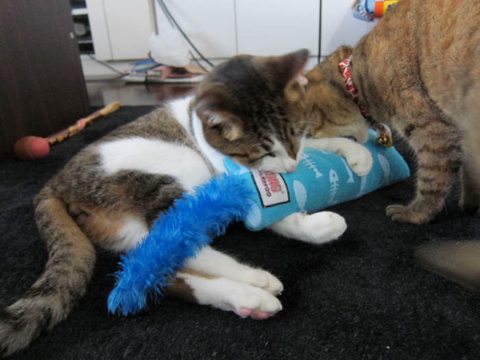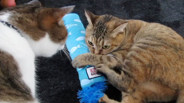 ぽっけ♂から猫キッカーを奪い取ったぴっち♀。