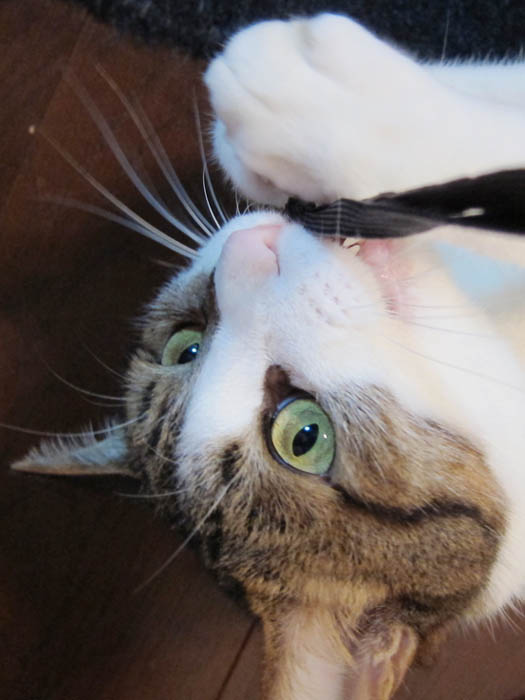 でストラップをキャッチして、ガブリとするぽっけ♂。