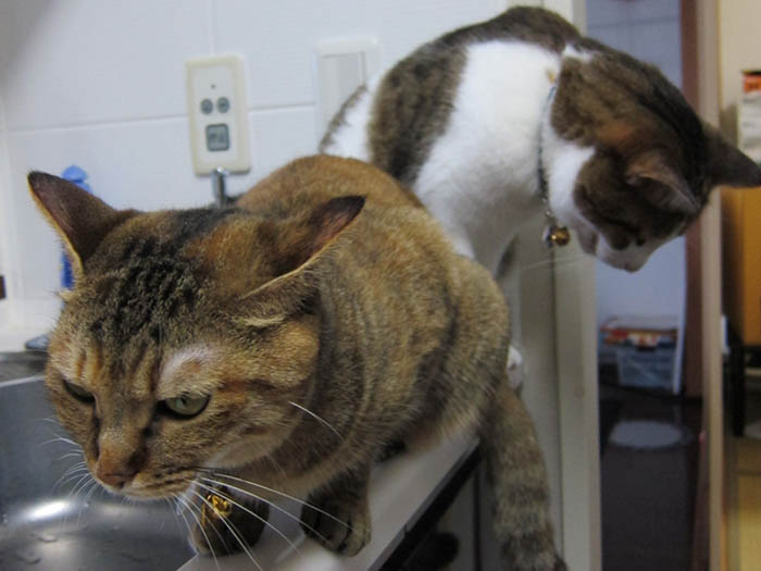 用の夕飯の準備の気配を察し、キッチンのカウンターに集合した2匹。
