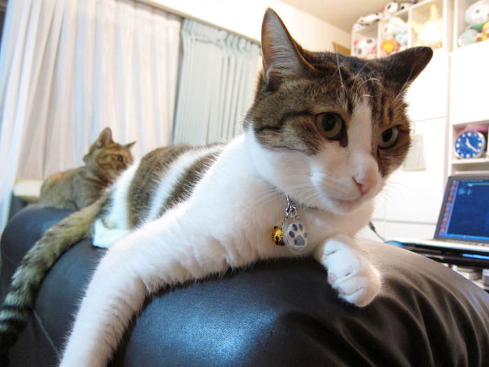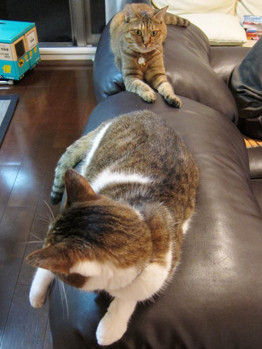 茶色ソファーの背もたれの上にやってきました。