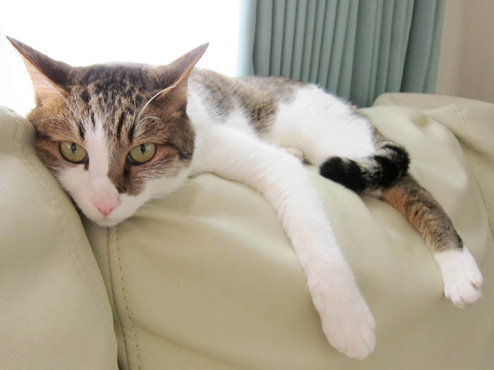 茶色ソファーの背もたれの上でダラリ。