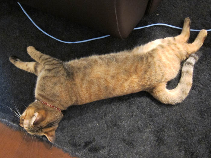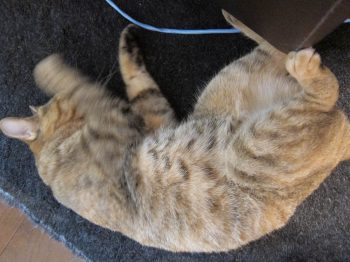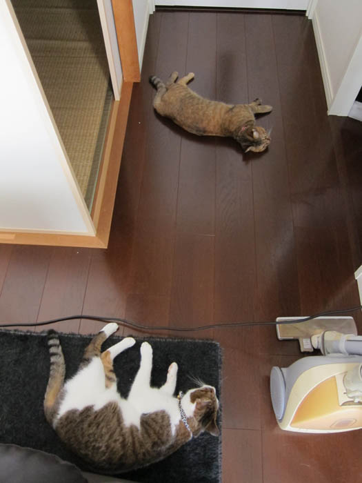 2010年 8/9(月) 723日目のぴっち♀とぽっけ♂ ~夏と猫と水~ 床と絨毯の上、どちらに転がるのがいいのか。真の回答がここに……。 水飲みぽっけ♂。