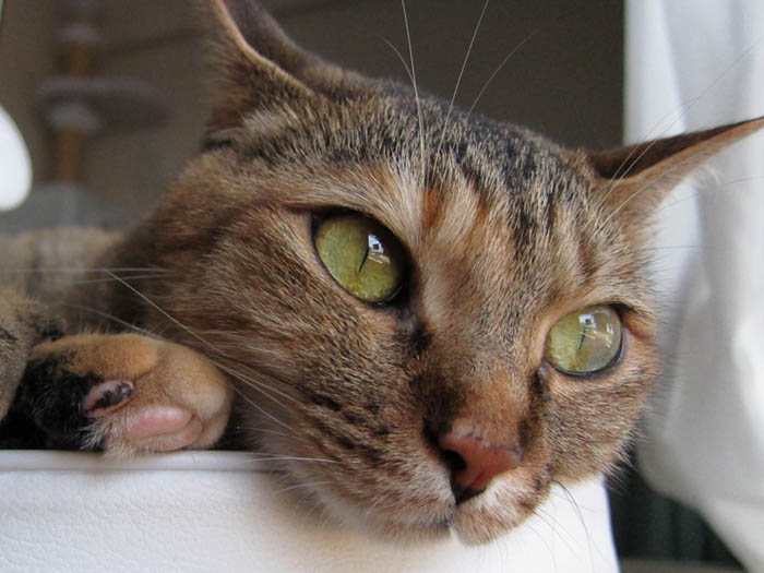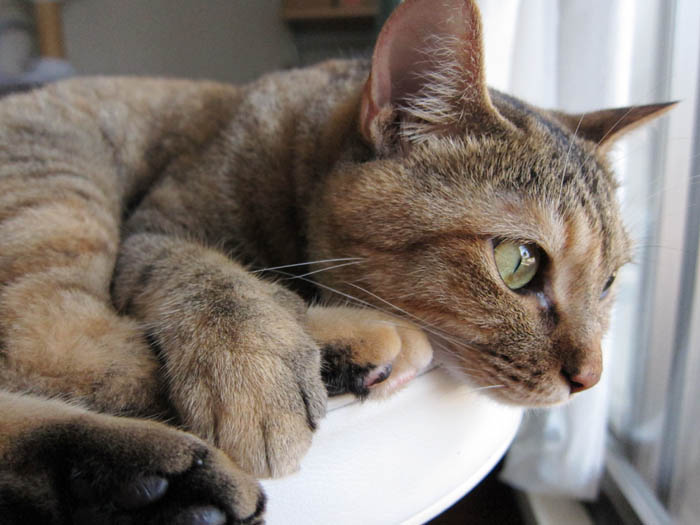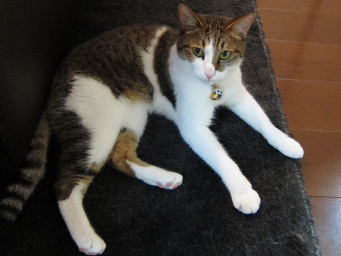 の膝の上がお気に入りです。前足