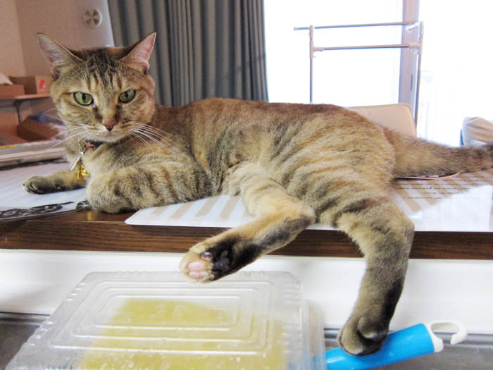カウンターに横たわるぴっち♀。
