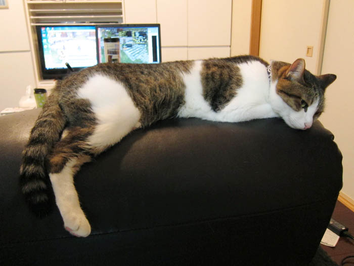 今度はリビングの茶色ソファーの背もたれで