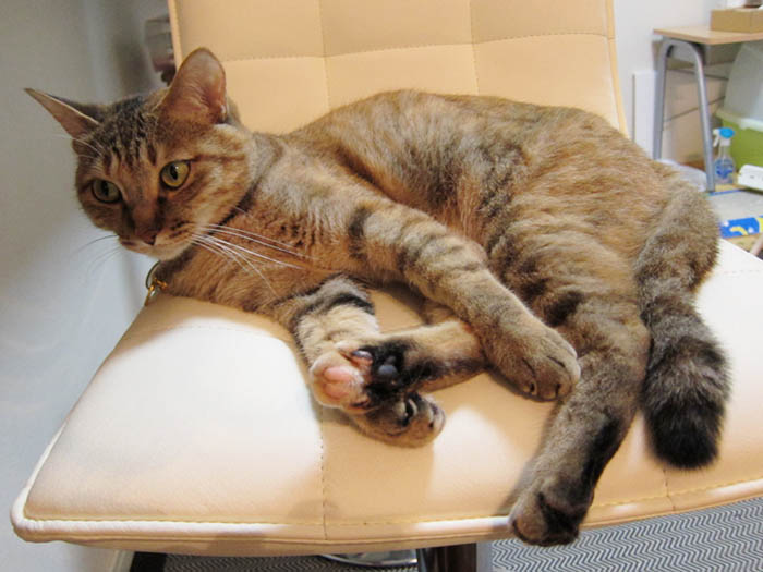 ミニテーブルの上に横になっての自己アピール中。