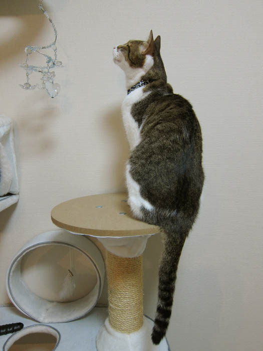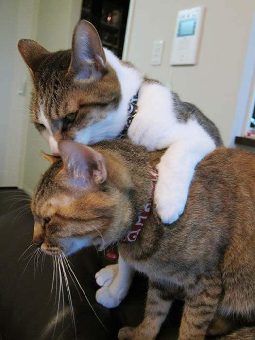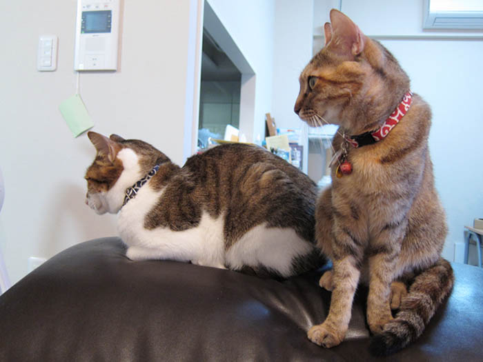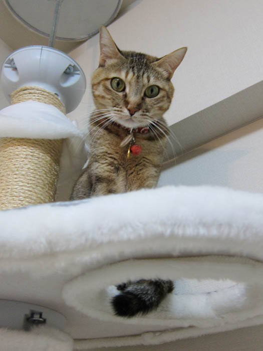 リビングを全力で走り回った後、猫タワーへ駆け上がった2匹。