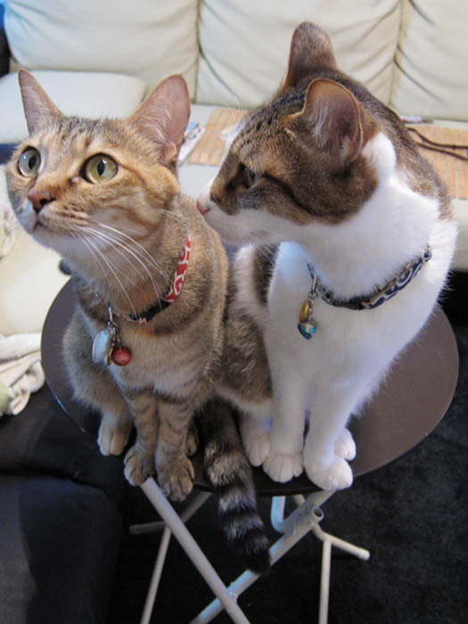 2匹から逃れようと立ち上がったら、テーブルに乗られました。