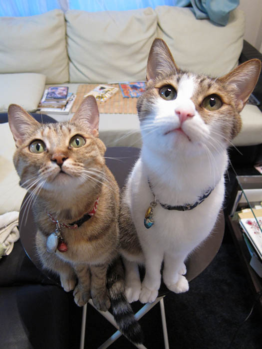 」 ソファーにいる私達のおやつを狙って近寄ってきた2匹。