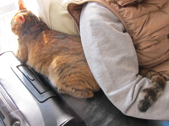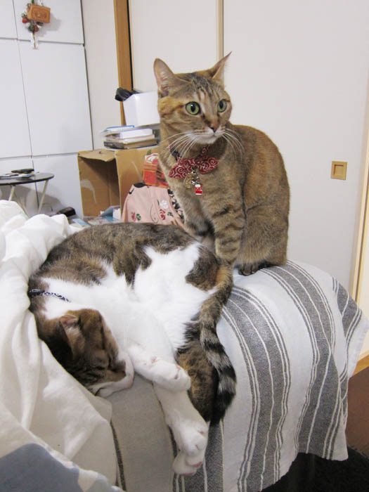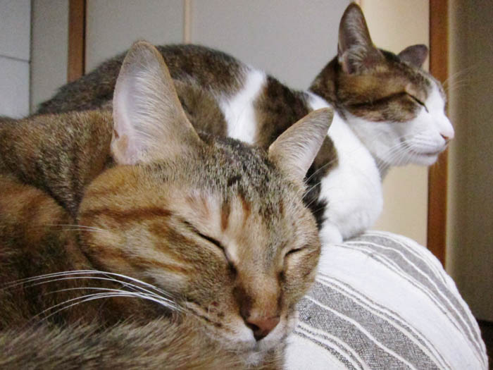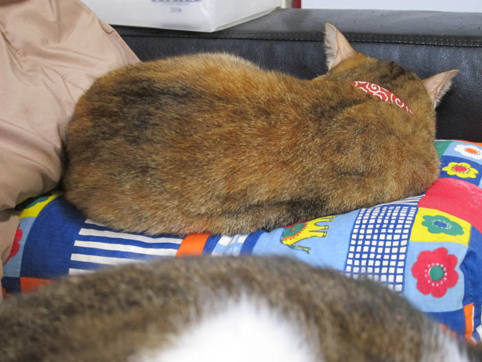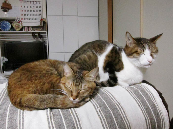 2012年 1/8(日) 1240日目のぴっち♀とぽっけ♂ ~積み猫~一緒にお昼寝をしている2匹が寄り添うというより、積まれていました。