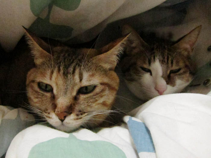 ソファーに置いた羽毛布団の上で眠る2匹。
