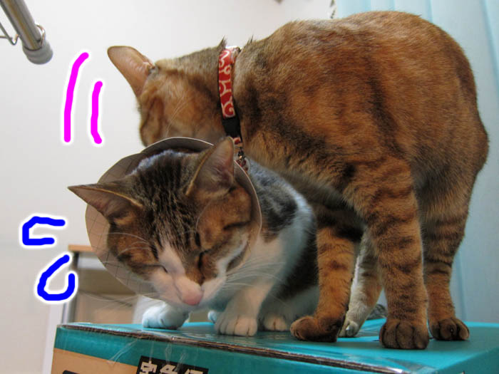 けれど、カラーがジャマして毛づくろいできないぽっけ♂を